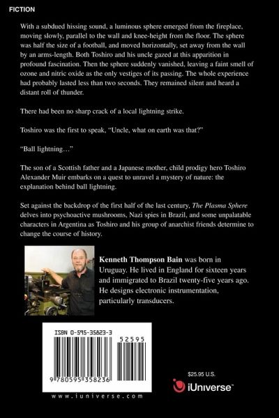 With a subdued hissing sound, a luminous sphere emerged from the fireplace, moving slowly, parallel to the wall and knee-height from the floor. The sphere was half the size of a football, and moved horizontally, set away from the wall by an arms-length. Both Toshiro and his uncle gazed at this apparition in profound fascination. Then the sphere suddenly vanished, leaving a faint smell of ozone and nitric oxide as the only vestiges of its passing. The whole experience had probably lasted less than two seconds. They remained silent and heard a distant roll of thunder. There had been no sharp crack of a local lightning strike. Toshiro was the first to speak, 'Uncle, what on earth was that?" 'Ball lightning." The son of a Scottish father and a Japanese mother, child prodigy hero Toshiro Alexander Muir embarks on a quest to unravel a mystery of nature: the explanation behind ball lightning. Set against the backdrop of the first half of the last century, The Plasma Sphere delves into psychoactive mushrooms, Nazi spies in Brazil, and some unpalatable characters in Argentina as Toshiro and his group of anarchist friends determine to change the course of history.