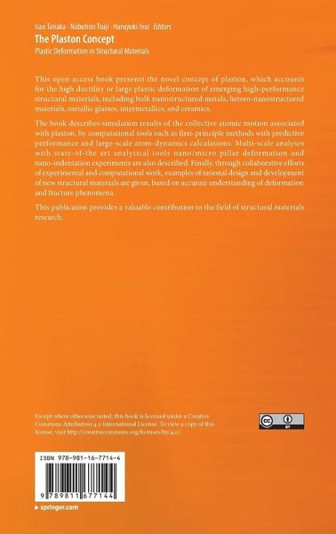 This open access book presents the novel concept of plaston, which accounts for the high ductility or large plastic deformation of emerging high-performance structural materials, including bulk nanostructured metals, hetero-nanostructured materials, metallic glasses, intermetallics, and ceramics.The book describes simulation results of the collective atomic motion associated with plaston, by computational tools such as first-principle methods with predictive performance and large-scale atom-dynamics calculations. Multi-scale analyses with state-of-the art analytical tools nano/micro pillar…mehr
