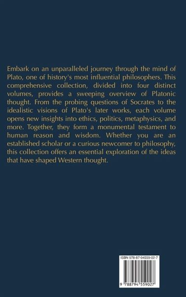 Embark on an unparalleled journey through the mind of Plato, one of history's most influential philosophers. This comprehensive collection, divided into four distinct volumes, provides a sweeping overview of Platonic thought. From the probing questions of Socrates to the idealistic visions of Plato's later works, each volume opens new insights into ethics, politics, metaphysics, and more. Together, they form a monumental testament to human reason and wisdom. Whether you are an established scholar or a curious newcomer to philosophy, this collection offers an essential exploration of the ideas that have shaped Western thought. The Socratic Dialogues: The Early Dialogues of Plato (Volume 1)Apology Laches, or Courage Charmides, or Temperance Lysis, or Friendship Euthyphro Ion Crito Euthydemus Gorgias Protagoras The Platonist Dialogues: The Transitional Dialogues of Plato (Volume 2)Meno Cratylus Phaedo Symposium Republic Phaedrus The Cosmological Dialogues: The Late Dialogues of Plato (Volume 3)Parmenides Theaetetus Sophist Statesman Timaeus Philebus Laws Critias The Apocryphal Dialogues: The Disputed Dialogues of Plato (Volume 4)Alcibiades I Alcibiades II Lesser Hippias Greater Hippias Eryxias Menexenus The Epinomis, or the Philosopher Theages Erastai, or Lovers Hipparchus Minos Clitopho Epistles / Seventh Letter