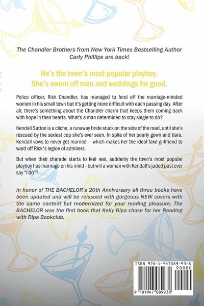 The Chandler Brothers from New York Times Bestselling Author Carly Phillips are back! He's the town's most popular playboy. She's sworn off men and weddings for good. Police officer, Rick Chandler, has managed to fend off the marriage-minded women in his small town but it's getting more difficult with each passing day. After all, there's something about the Chandler charm that keeps them coming back with hope in their hearts. What's a man determined to stay single to do? Kendall Sutton is a cliche, a runaway bride stuck on the side of the road, until she's rescued by the sexiest cop she's ever seen. In spite of her pearly gown and tiara, Kendall vows to never get married-which makes her the ideal fake girlfriend to ward off Rick's legion of admirers. But when their charade starts to feel real, suddenly the town's most popular playboy has marriage on his mind - but will a woman with Kendall's jaded past ever say "I do"? In honor of THE BACHELOR's 20th Anniversary all three books have been updated and will be reissued with gorgeous NEW covers with the same content but modernized for your reading pleasure. The BACHELOR was the first book that Kelly Ripa chose for her Reading with Ripa Bookclub.