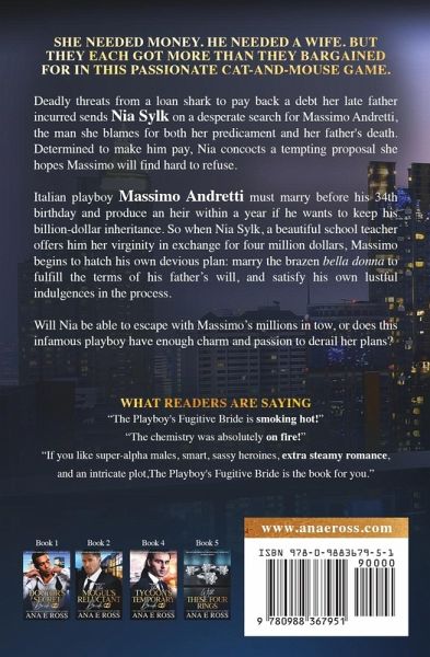 She needed money. He needed a wife. But they each got more than they bargained for in this passionate cat-and-mouse game. Deadly threats from a loan shark to pay back a debt her late father incurred sends Nia Sylk on a desperate search for Massimo Andretti, the man she blames for both her predicament and her father's death. Determined to make him pay, Nia concocts a tempting proposal she hopes Massimo will find hard to refuse. Italian playboy Massimo Andretti must marry before his 34th birthday and produce an heir within a year if he wants to keep his billion-dollar inheritance. So when Nia Sylk, a beautiful school teacher offers him her virginity in exchange for four million dollars, Massimo begins to hatch his own devious plan: marry the brazen bella donna to fulfill the terms of his father's will, and satisfy his own lustful indulgences in the process. Will Nia be able to escape with Massimo's millions in tow, or does this infamous playboy have enough charm and passion to derail her plans?