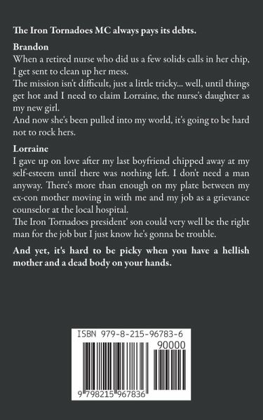The Iron Tornadoes MC always pays its debts. Brandon When a retired nurse who did us a few solids calls in her chip, I get sent to clean up her mess. The mission isn't difficult, just a little tricky... well, until things get hot and I need to claim Lorraine, the nurse's daughter as my new girl. And now she's been pulled into my world, it's going to be hard not to rock hers. Lorraine I gave up on love after my last boyfriend chipped away at my self-esteem until there was nothing left. I don't need a man anyway. There's more than enough on my plate between my ex-con mother moving in with me and my job as a grievance counselor at the local hospital. The Iron Tornadoes president' son could very well be the right man for the job but I just know he's gonna be trouble. And yet, it's hard to be picky when you have a hellish mother and a dead body on your hands.