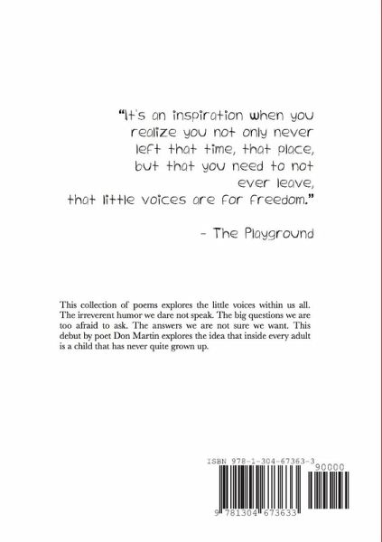 This collection of poems explores the little voices within us all. The irreverent humor we dare not speak. The big questions we are too afraid to ask. The answers we are not sure we want. This debut by poet Don Martin explores the idea that inside every adult is a child that has never quite grown up.