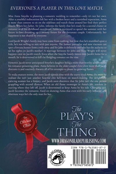 Everyone's a player in this love match. Miss Anna Smythe is planning a romantic wedding to remember-only it's not her own. After a youthful indiscretion left her with a broken heart and a tarnished reputation, Anna is more than content to sit on the sidelines and watch those around her find their perfect match. When her father, Sir John, informs the family that he's ready for a second chance at romance with his childhood sweetheart, Anna is overjoyed to spend the summer with her future in-laws dreaming up a swoony future for the fortunate couple. Unfortunately, her happiness is not shared by everyone. Lord Jacob Wright's family may have come from nothing, but now that he's stumbled upon a title, he's not willing to mix with just anyone. The former journalist and new viscount can spot a fortune hunter from a mile away and Sir John is definitely one who has the audacity to set his sights on Jacob's mother! A marriage between Sir John and Rose Wright will never happen-not on Jacob's watch. Even when the Smythe family moves into Jacob's home for a month, he is determined to kill the fledgling romance on the vine. However, Jacob never anticipated Smythe's daughter being a more than worthy adversary for his romance-poisoning plans. Anna believes in the older couple's love even more than Jacob distrusts it and routinely thwarts all of his attempts to douse its growing flames. To make matters worse, the more Jacob spends time with the starry-eyed Anna, the more he realizes she isn't just another fanciful chit hell-bent on match-making. The delightfully enticing woman has a history, and Jacob soon discovers that Sir John isn't the one person grappling with second chances. When an old flame reemerges in Anna's life, resolute in starting where they left off, Jacob is determined to keep Anna by his side. Changing tact, Jacob becomes the romantic, fixed on showing Anna that even with his surly behavior and obstinate ways he's the only man for her. Can a few charming picnics, a hermit's cottage, and chance encounters with circus strongwomen keep Anna from wondering about what might have been with her old flame? Will the bonds of young love be too tight for Anna to break, or can Jacob help her see that the best love is yet to come? The Cricket Club Book 1 - A Perfect Match Book 2 - The Play's the Thing Book 3 - Love Sport Book 4 - Match Made in Heaven Book 5 - The Lucky Catch Book 6 - The Perfect Score