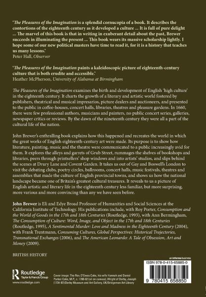 The Pleasures of the Imagination examines the birth and development of English "high culture" in the eighteenth century. It charts the growth of a literary and artistic world fostered by publishers, theatrical and musical impresarios, picture dealers and auctioneers, and presented to th public in coffee-houses, concert halls, libraries, theatres and pleasure gardens. In 1660, there were few professional authors, musicians and painters, no public concert series, galleries, newspaper critics or reviews. By the dawn of the nineteenth century they were all aprt of the cultural life of the nation. John Brewer's enthralling book explains how this happened and recreates the world in which the great works of English eighteenth-century art were made. Its purpose is to show how literature, painting, music and the theatre were communicated to a public increasingly avid for them. It explores the alleys and garrets of Grub Street, rummages the shelves of bookshops and libraries, peers through printsellers' shop windows and into artists' studios, and slips behind the scenes at Drury Lane and Covent Garden. It takes us out of Gay and Boswell's London to visit the debating clubs, poetry circles, ballrooms, concert halls, music festivals, theatres and assemblies that made the culture of English provincial towns, and shows us how the national landscape became one of Britain's greatest cultural treasures. It reveals to us a picture of English artistic and literary life in the eighteenth century less familiar, but more suprising, more various and more convincing than any we have seen before.