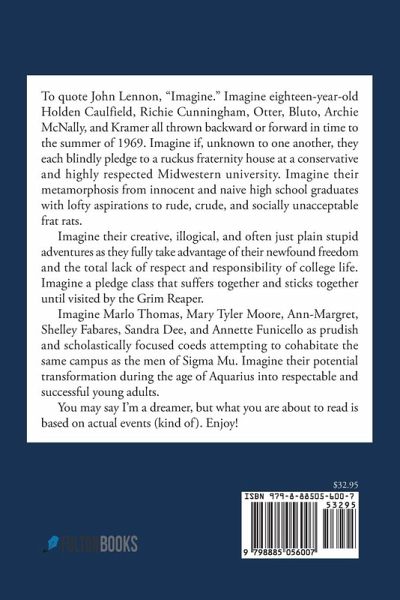 To quote John Lennon, "Imagine." Imagine eighteen-year-old Holden Caulfield, Richie Cunningham, Otter, Bluto, Archie McNally, and Kramer all thrown backward or forward in time to the summer of 1969. Imagine if, unknown to one another, they each blindly pledge to a ruckus fraternity house at a conservative and highly respected Midwestern university. Imagine their metamorphosis from innocent and naive high school graduates with lofty aspirations to rude, crude, and socially unacceptable frat rats. Imagine their creative, illogical, and often just plain stupid adventures as they fully take advantage of their newfound freedom and the total lack of respect and responsibility of college life. Imagine a pledge class that suffers together and sticks together until visited by the Grim Reaper. Imagine Marlo Thomas, Mary Tyler Moore, Ann-Margret, Shelley Fabares, Sandra Dee, and Annette Funicello as prudish and scholastically focused coeds attempting to cohabitate the same campus as the men of Sigma Mu. Imagine their potential transformation during the age of Aquarius into respectable and successful young adults. You may say I'm a dreamer, but what you are about to read is based on actual events (kind of). Enjoy!