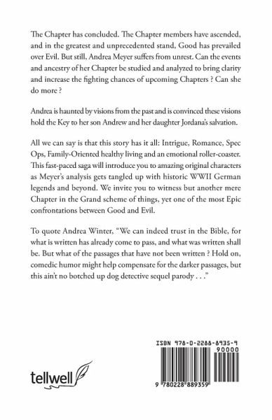 The Chapter has concluded. The Chapter members have ascended, and in the greatest and unprecedented stand, good has prevailed over evil. But still, Andrea Meyer suffers from unrest. Can the events and ancestry of her Chapter be studied and analyzed to bring clarity and increase the fighting chances of upcoming Chapters? Can she do more ? Andrea is haunted by visions from the past and is convinced these visions hold the Key to her son Andrew's and her daughter Jordana's salvation. All we can say is that this story has it all: intrigue, romance, spec ops, family-oriented healthy living and an emotional roller-coaster. This fast-paced saga will introduce you to amazing original characters as Meyer's analysis gets tangled up with historic WWII German legends and beyond. We invite you to witness but another mere chapter in the grand scheme of things, yet one of the most epic confrontations between good and evil. To quote Andrea Winter, "We can indeed trust in the Bible, for what is written has already come to pass, and what was written shall be. But what of the passages that have not been written ? Hold on, comedic humor might help compensate for the darker passages, but this ain't no botched up dog detective sequel parody . . ."