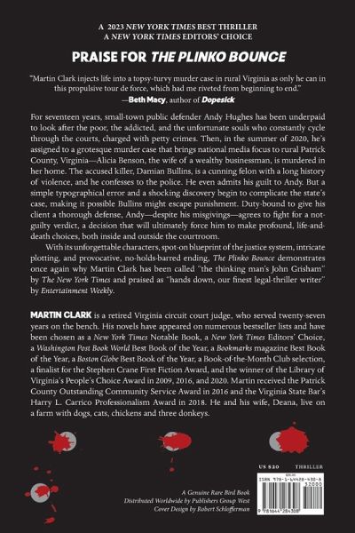 Martin Clark is a retired Virginia circuit court judge, who served twenty-seven years on the bench. His novels have appeared on numerous bestseller lists and have been chosen as a New York Times Notable Book, a New York Times Editors' Choice, a Washington Post Book World Best Book of the Year, a Bookmarks magazine Best Book of the Year, a Boston Globe Best Book of the Year, a Book-of-the-Month Club selection, a finalist for the Stephen Crane First Fiction Award, and the winner of the Library of Virginia's People's Choice Award in 2009, 2016 and 2020. Martin received the Patrick County Outstanding Community Service Award in 2016 and the Virginia State Bar's Harry L. Carrico Professionalism Award in 2018. He and his wife, Deana, live on a farm with dogs, cats, chickens and three donkeys.