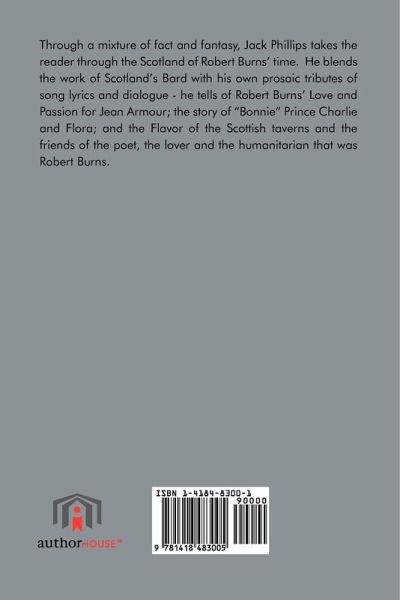 Through a mixture of fact and fantasy, Jack Phillips takes the reader through the Scotland of Robert Burns' time. He blends the work of Scotland's Bard with his own prosaic tributes of song lyrics and dialogue - he tells of Robert Burns' Love and Passion for Jean Armour; the story of "Bonnie" Prince Charlie and Flora; and the Flavor of the Scottish taverns and the friends of the poet, the lover and the humanitarian that was Robert Burns.