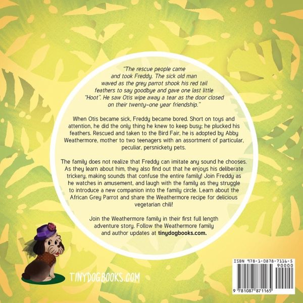 "The rescue people came and took Freddy. The sick old man waved as the grey parrot shook his red tail feathers to say goodbye and gave one last little "Hoot". He saw Otis wipe away a tear as the door closed on their twenty-one year friendship." When Otis became sick, Freddy became bored. Short on toys and attention, he did the only thing he knew to keep busy; he plucked his feathers. Rescued and taken to the Bird Fair, he is adopted by Abby Weathermore, mother to two teenagers with an assortment of particular, peculiar, persnickety pets. The family does not realize that Freddy can imitate any sound he chooses. As they learn about him, they also find out that he enjoys deliberate trickery, making sounds that confuse the entire family! Join Freddy as he watches in amusement, and laugh with the family as they struggle to introduce a new companion into the family circle. Learn about the African Grey Parrot and share the Weathermore recipe for delicious vegetarian chili! Follow the Weathermore family series and author updates at tinydogbooks.com.