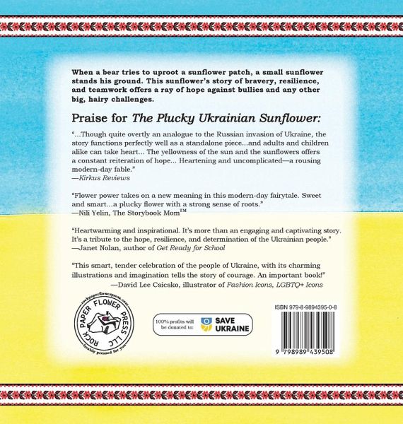 Kirkus Reviews says, "OUR VERDICT ¿ GET IT ...its message of resilience is universal... Heartening... a rousing modern-day fable."When a bear tries to uproot a sunflower patch, a small sunflower stands his ground. This sunflower's story of bravery, resilience, and teamwork offers a ray of hope against bullies and any other big, hairy challenges. Support a children's cause: Make a difference! 100% profits from the book will be donated to Save Ukraine to help children and families affected by war. Praise for the book: ¿¿¿¿¿ Readers' Favorite 5 Stars "...introduces the war in Ukraine on a child's level... The story is filled with rich symbolism... illustrations...are full of delightful details..." Empowering message: Perfect for kids ages 4-8, this inspiring book about courage helps children stand up to bullying even when they're scared. Adults love it too! Educational value: Discover Ukrainian culture and the world of sunflowers. Includes 18 facts about Ukraine and the sunflower, Ukraine's national flower. A work of art: Features 27 full-color, hand-painted illustrations created by an award-winning artist. Human-made. Full of heart: This mother-daughter team with Ukrainian roots created a heartfelt book for you, the children you love, and to help Ukraine's children. Gives twice: Makes a great gift and it gives to Ukrainian children. Be a part of it! 100% profits go to Save Ukraine, a 501(c)(3) charity. Pick The Plucky Ukrainian Sunflower! Click BUY!