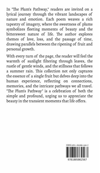 In "The Plum's Pathway," readers are invited on a lyrical journey through the vibrant landscapes of nature and emotion. Each poem weaves a rich tapestry of imagery, where the sweetness of plums symbolizes fleeting moments of beauty and the bittersweet nature of life. The author explores themes of love, loss, and the passage of time, drawing parallels between the ripening of fruit and personal growth. With every turn of the page, the reader will feel the warmth of sunlight filtering through leaves, the rustle of gentle winds, and the stillness that follows a summer rain. This collection not only captures the essence of a single fruit but delves deep into the human experience, reflecting on connections, memories, and the intricate pathways we all travel. "The Plum's Pathway" is a celebration of both the simple and profound, urging us to appreciate the beauty in the transient moments that life offers.