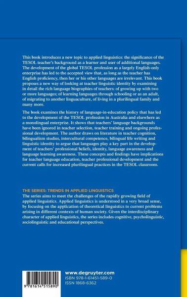 The book examines the history of language-in-education policy which has led to the development of the TESOL profession in Australia and elsewhere as a monolingual enterprise. It shows that teachers' language backgrounds have been ignored in teacher selection, teacher training and ongoing professional development. The author draws on literature in teacher cognition, bilingualism studies, intercultural competence, bilingual lifewriting and linguistic identity to argue that languages play a key part in the development of teachers' professional beliefs, identity, language awareness and language learning awareness.
