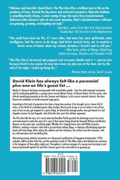 The Plus-One is about life on the periphery of fame, but it's also a compelling family drama, a comic coming-of-age tale, and a fizzy musical memoir set during the final throes of the pre-digital 20th century. Starting in the backseat of Courtney Love's limo and then shifting deeper into the past, The Plus-One is the story of David Klein, a music-obsessed bumbler finally granted the backstage access he craves and determined to make the most of it-even if that means being dissed by Gwyneth Paltrow and Marilyn Manson in the same epic, mortifying night. Whether he's singing bossa nova with Philip Seymour Hoffman, stealing a woman's shoe with a just-pre-fame Johnny Depp, or sharing a life-changing cigarette break with Lady Gaga, The Plus-One is told with a blend of acid wit and warm humanity.Alternating among celebrity encounters-with such pop culture icons as Winona Ryder, Ringo Starr, Bono, Arthur Miller, Phil Spector, and Tom Petty-are sharp-eyed recollections of long-gone demimondes: 1970s suburbia, AIDS-era New York City, and the workaday world of '90s office culture that blinked into existence in the hangover of those glitzy nights out. Throughout, a picture emerges of a young man learning to quit measuring himself against his own life's famous guest stars and settle in to growing up.