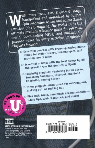 With more than two thousand songs handpicked and organized by former Spin magazine writer and editor Sarah Lewitinn (aka Ultragrrrl), The Pocket DJ is the ultimate insider's reference guide for selecting music, downloading MP3s, and making all-purpose mixes for every occasion imaginable. Playlists include: . Essential genres: with crowd-pleasing dance mixes for indie rockers, headbangers, and hip-hop lovers alike . Essential artists: with the best songs by all the greats from the Beatles to Björk . Celebrity playlists: featuring Duran Duran, Smahing Pumpkins, Interpol, and Good Charlotte, among others . Other playlists: with tunes for working out, making out, or rocking out . Plus rock trivia, new music recommendations, DJing tips, Web resources, and more!