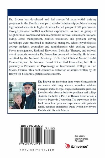 Dr. Brown has developed and led successful experiential training programs in the Florida swamps to resolve relationship problems among high school students in high-risk areas. He led groups of 300 pharmacists through personal conflict resolution experiences, as well as groups of neighborhood women and men in emotional survival encounters. Rational living, stress management, conflict resolution, and problem solving workshops were presented to industrial managers, school psychologists, college students, counselors and administrators with exciting success. Stress management, Rational Emotional Behavior Therapy, and rational use of hypnosis are topics Dr. Brown has presented nationally. He is board certified by the National Academy of Certified Clinical Mental Health Counselors, and the National Board of Certified Counselors, Inc. He is presently a Professor of Psychology at International College in Fort Myers, Florida. This book contains a collection of stories written by Dr. Brown for his family, patients and students.