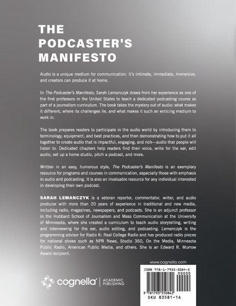 Audio is a unique medium for communication. It's intimate, immediate, immersive, and creators can produce it at home. In The Podcaster's Manifesto, Sarah Lemanczyk draws from her experience as one of the first professors in the United States to teach a dedicated podcasting course as part of a journalism curriculum. The book takes the mystery out of audio: what makes it different, where its challenges lie, and what makes it such an enticing medium to work in. The book prepares readers to participate in the audio world by introducing them to terminology, equipment, and best practices, and then demonstrating how to put it all together to create audio that is impactful, engaging, and rich-audio that people will listen to. Dedicated chapters help readers find their voice, write for the ear, edit audio, set up a home studio, pitch a podcast, and more. Written in an easy, humorous style, The Podcaster's Manifesto is an exemplary resource for programs and courses in communication, especially those with emphasis in audio and podcasting. It is also an invaluable resource for any individual interested in developing their own podcast.