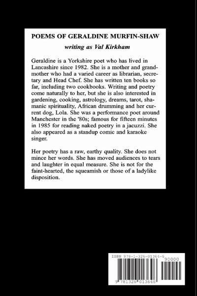 Geraldine is a Yorkshire poet who has lived in Lancashire since 1982. She is a mother and grandmother who had a varied career as librarian, secretary and Head Chef. She has written ten books so far, including two cookbooks. Writing and poetry come naturally to her, but she is also interested in gardening, cooking, astrology, dreams, tarot, shamanic spirituality, African drumming and her current dog, Lola. She was a performance poet around Manchester in the '80s; famous for fifteen minutes in 1985 for reading naked poetry in a jacuzzi. She also appeared as a standup comic and karaoke singer. Her poetry has a raw, earthy quality. She does not mince her words. She has moved audiences to tears and laughter in equal measure. She is not for the faint-hearted, the squeamish or those of a ladylike disposition.