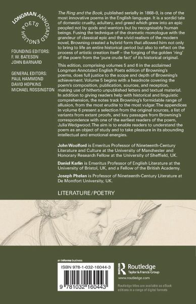 Note by the General Editors Acknowledgments List of Illustrations Abbreviations and References The Ring and the Book Headnote Book I: The Ring and the Book Book II: Half-Rome Book III: Other Half-Rome Book IV: Tertium Quid Book V: Count Guido Franceschini Book VI: Giuseppe Caponsacchi Book VII: Pompilia Book VIII: Dominus Hyacinthus de Archangelis, Pauperum Procurator Book IX: Juris Doctor Johannes-Baptista Bottinius, Fisci et Rev. Cam. Apostol. Advocatus Book X: The Pope Book XI: Guido Book XII: The Book and the Ring Appendix A: Translations of the 'old yellow book' Appendix B: Morte Dell' Uxoricida Guido Franceschini Decapitato [The Death of the Wife-Murderer Guido Franceschini, by Beheading] (the 'Secondary Source' of The Ring and the Book) Appendix C: The depositions of Francesca (Pompilia) and Caponsacchi in the 'old yellow book' Appendix D: Authorial variants in the first American edition Appendix E: Variants in Yale sheets Appendix F: Selections from Browning's correspondence with Julia Wedgwood