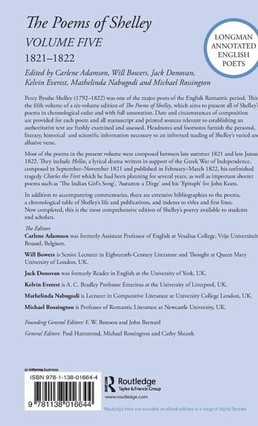 Percy Bysshe Shelley (1792-1822) was one of the major poets of the English Romantic period. This is the fifth volume of a six-volume edition of The Poems of Shelley, which aims to present all of Shelley's poems in chronological order and with full annotation. Date and circumstances of composition are provided for each poem and all manuscript and printed sources relevant to establishing an authoritative text are freshly examined and assessed. Headnotes and footnotes furnish the personal, literary, historical and scientific information necessary to an informed reading of Shelley's varied and allusive verse.