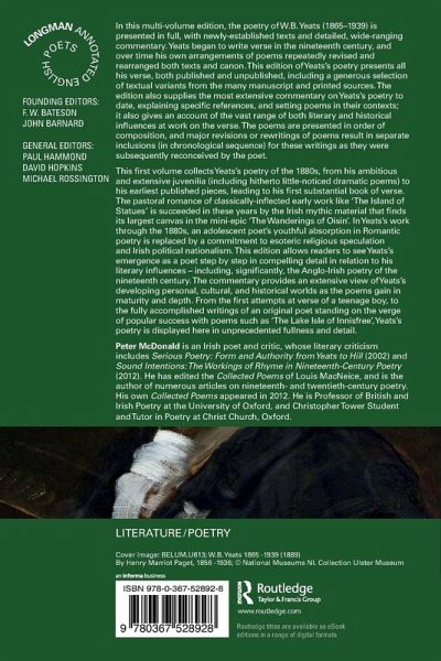 This first volume collects Yeats's poetry of the 1880s, from his ambitious and extensive juvenilia (including hitherto little-noticed dramatic poems) to his earliest published pieces, leading to his first substantial book of verse. The pastoral romance of classically-inflected early work like 'The Island of Statues' is succeeded in these years by the Irish mythic material that finds its largest canvas in the mini-epic 'The Wanderings of Oisin'. In Yeats's work through the 1880s, an adolescent poet's youthful absorption in Romantic poetry is replaced by a commitment to esoteric religious speculation and Irish political nationalism. This edition allows readers to see Yeats's emergence as a poet step by step in compelling detail in relation to his literary influences - including, significantly, the Anglo-Irish poetry of the nineteenth century. The commentary provides an extensive view of Yeats's developing personal, cultural, and historical worlds as the poems gain in maturity and depth. From the first attempts at verse of a teenage boy to the fully accomplished writings of an original poet standing on the verge of popular success with poems such as 'The Lake Isle of Innisfree', Yeats's poetry is displayed here in unprecedented fullness and detail.