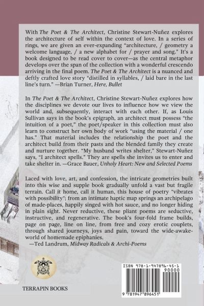 In The Poet & The Architect, Christine Stewart-Nuñez explores how the disciplines we devote our lives to influence how we view the world and, subsequently, interact with each other. If, as Louis Sullivan says in the book's epigraph, an architect must possess "the intuition of a poet," the poet/speaker in this collection must also learn to construct her own body of work "using the material / one has." That material includes the relationship the poet and the architect build from their pasts and the blended family they create and nurture together. "My husband writes shelter," Stewart-Nuñez says, "I architect spells." They are spells she invites us to enter and take shelter in. -Grace Bauer