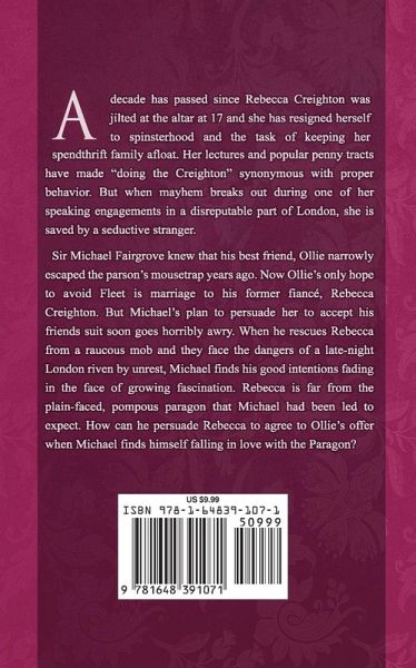A decade has passed since Rebecca Creighton was jilted at the altar at 17 and she has resigned herself to spinsterhood and the task of keeping her spendthrift family afloat. Her lectures and popular penny tracts have made "doing the Creighton" synonymous with proper behavior. But when mayhem breaks out during one of her speaking engagements in a disreputable part of London, she is saved by a seductive stranger. Sir Michael Fairgrove knew that his best friend, Ollie narrowly escaped the parson's mousetrap years ago. Now Ollie's only hope to avoid Fleet is marriage to his former fiancé, Rebecca Creighton. But Michael's plan to persuade her to accept his friend's suit soon goes horribly awry. When he rescues Rebecca from a raucous mob and they face the dangers of a late-night London riven by unrest, Michael finds his good intentions fading in the face of growing fascination. Rebecca is far from the plain-faced, pompous paragon that Michael had been led to expect. How can he persuade Rebecca to agree to Ollie's offer when Michael finds himself falling in love with the Paragon?