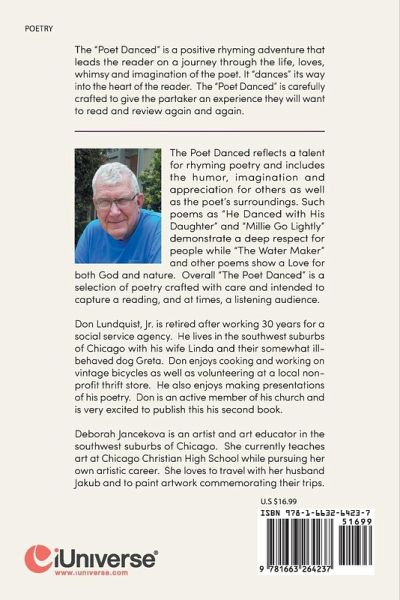 The Poet Danced reflects a talent for rhyming poetry and includes the humor, imagination and appreciation for others as well as the poet's surroundings. Such poems as "He Danced with His Daughter" and "Millie Go Lightly" demonstrate a deep respect for people while "The Water Maker" and other poems show a Love for both God and nature. Overall "The Poet Danced" is a selection of poetry crafted with care and intended to capture a reading, and at times, a listening audience. Don Lundquist, Jr. is retired after working 30 years for a social service agency. He lives in the southwest suburbs of Chicago with his wife Linda and their somewhat ill behaved dog Greta. Don enjoys cooking and working on vintage bicycles as well as volunteering at a local nonprofit thrift store. He also enjoys making presentations of his poetry. Don is an active member of his church and is very excited to publish this his second book. Deborah Jancekova is an artist and art educator in the southwest suburbs of Chicago. She currently teaches art at Chicago Christian High School while pursuing her own artistic career. She loves to travel with her husband Jakub and to paint artwork commemorating their trips.