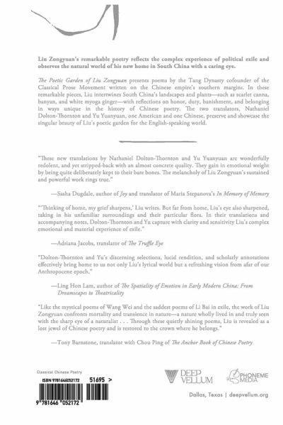 "Written in exile, Liu Zongyuan's remarkable poetry reflects the experience of banishment, flickering political ambition, and landscape, deeply imbued with the natural atmosphere of South China. The Poetic Garden of Liu Zongyuan introduces poems that the Chinese writer drafted while in exile on the Chinese empire's southern margins. In these remarkable pieces, Liu intertwines South China's landscapes and plants-such as scarlet canna, banyan, and white myoga ginger-with reflections on honor, duty, banishment, and belonging in ways unique in the history of Chinese poetry. This collection's two translators, Nathaniel Dolton-Thornton and Yu Yuanyuan, one American and one Chinese, preserve the singular beauty of Liu's poetic garden and introduce it to the English-speaking world"--