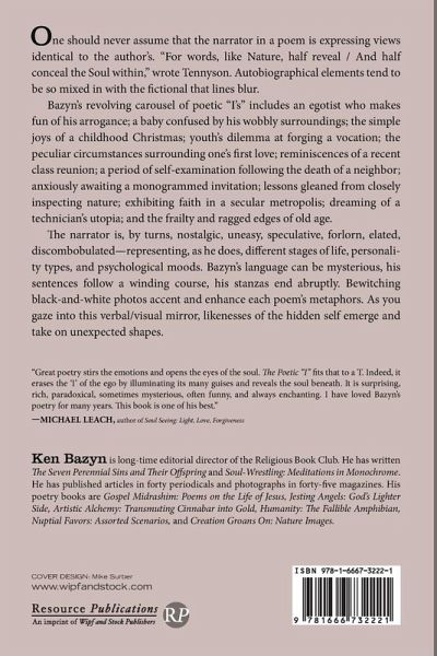 Ken Bazyn is long-time editorial director of Religious Book Club. He has written The Seven Perennial Sins and Their Offspring and Soul-Wrestling: Meditations in Monochrome. He has published articles in forty periodicals, from Commonweal to Dialog, and his photographs have appeared in forty-five magazines. His previous books of poetry are Gospel Midrashim, Jesting Angels, Artistic Alchemy, Humanity, Nuptial Favors, Creation Groans On, The Poetic ""I,"" and Apocalyptic Fervor.