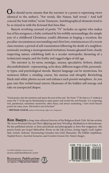 One should never assume that the narrator in a poem is expressing views identical to the author's. ""For words, like Nature, half reveal / And half conceal the Soul within,"" wrote Tennyson. Autobiographical elements tend to be so mixed in with the fictional that lines blur. Bazyn's revolving carousel of poetic ""I's"" includes an egotist who makes fun of his arrogance; a baby confused by his wobbly surroundings; the simple joys of a childhood Christmas; youth's dilemma at forging a vocation; the peculiar circumstances surrounding one's first love; reminiscences of a recent class reunion; a period of self-examination following the death of a neighbor; anxiously awaiting a monogrammed invitation; lessons gleaned from closely inspecting nature; exhibiting faith in a secular metropolis; dreaming of a technician's utopia; and the frailty and ragged edges of old age. The narrator is, by turns, nostalgic, uneasy, speculative, forlorn, elated, discombobulated--representing, as he does, different stages of life, personality types, and psychological moods. Bazyn's language can be mysterious, his sentences follow a winding course, his stanzas end abruptly. Bewitching black-and-white photos accent and enhance each poem's metaphors. As you gaze into this verbal/visual mirror, likenesses of the hidden self emerge and take on unexpected shapes.