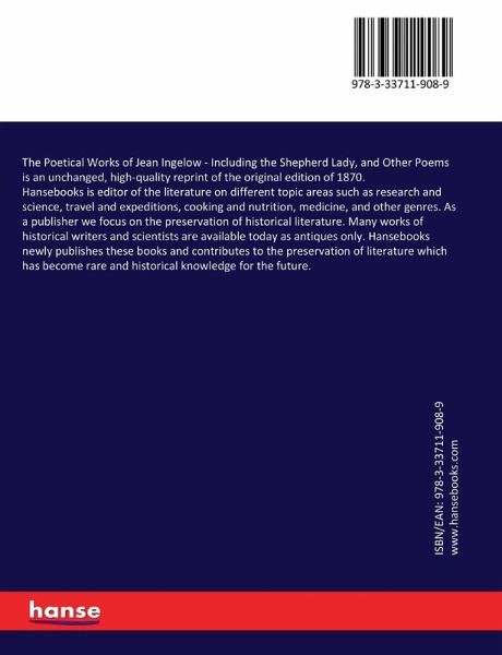 The Poetical Works of Jean Ingelow - Including the Shepherd Lady, and Other Poems is an unchanged, high-quality reprint of the original edition of 1870.Hansebooks is editor of the literature on different topic areas such as research and science, travel and expeditions, cooking and nutrition, medicine, and other genres. As a publisher we focus on the preservation of historical literature. Many works of historical writers and scientists are available today as antiques only. Hansebooks newly publishes these books and contributes to the preservation of literature which has become rare and historical knowledge for the future.