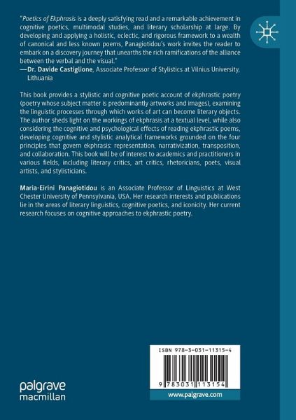 This book provides a stylistic and cognitive poetic account of ekphrastic poetry (poetry whose subject matter is predominantly artworks and images), examining the linguistic processes through which works of art can become literary objects. The author sheds light on the workings of ekphrasis at a textual level, while also considering the cognitive and psychological effects of reading ekphrastic poems, developing cognitive and stylistic analytical frameworks grounded on the four principles that govern ekphrasis: representation, narrativization, transposition, and collaboration. This book will be of interest to academics and practitioners in various fields, including literary critics, art critics, rhetoricians, poets, visual artists, and stylisticians.