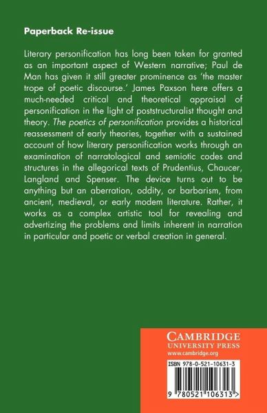 Literary personification has long been taken for granted as an important aspect of Western narrative; Paul de Man has given it still greater prominence as 'the master trope of poetic discourse'. James Paxson here offers a much-needed critical and theoretical appraisal of personification in the light of poststructuralist thought and theory. The poetics of personification provides a historical reassessment of early theories, together with a sustained account of how literary personification works through an examination of narratological and semiotic codes and structures in the allegorical texts of Prudentius, Chaucer, Langland and Spenser. The device turns out to be anything but an aberration, oddity or barbarism, from ancient, medieval or early modern literature. Rather, it works as a complex artistic tool for revealing and advertising the problems and limits inherent in narration in particular and poetic or verbal creation in general.