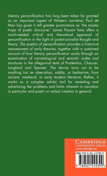 Literary personification has long been taken for granted as an important aspect of Western narrative; Paul de Man has given it still greater prominence as 'the master trope of poetic discourse'. James Paxson here offers a much-needed critical and theoretical appraisal of personification in the light of poststructuralist thought and theory. The poetics of personification provides a historical reassessment of early theories, together with a sustained account of how literary personification works through an examination of narratological and semiotic codes and structures in the allegorical texts of Prudentius, Chaucer, Langland and Spenser. The device turns out to be anything but an aberration, oddity or barbarism, from ancient, medieval or early modern literature. Rather, it works as a complex artistic tool for revealing and advertising the problems and limits inherent in narration in particular and poetic or verbal creation in general.