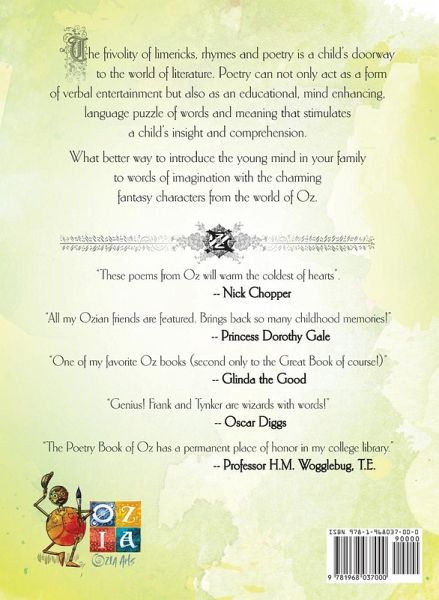 The Poetry Book of Oz: A Collection of New & Classic Ozian Rhymes for the Child in All of Us. Compiled from the pages of original Wizard of Oz novels by L. Frank Baum, with additional verses by Emerald City artist & green whiskered soldier, Tynker Smyth - THE POETRY BOOK OF OZ is a brand new, beautifully designed, 8.25x11, 100 page hardcover collection of classic Ozian poetry celebrating the 125th Anniversary of The Wonderful Wizard of Oz novel. Complimenting the enchanting words are over 40 water-colored illustrations based on the vintage works of John R. Neill and WW Denslow which have been meticulously rearranged, reassembled and reimagined in full color. At Ozia Arts Press we feel rhymes and poetry are a child's doorway to the magic of reading. Poems not only act as a form of amusing, verbal entertainment but also as an educational, language puzzle of words and meaning that can stimulate a child's insight and comprehension. What better way to introduce the young mind in your family to words of imagination with the charming fantasy characters from the world of Oz! An Oziana collector's bonus too! The Poetry Book of Oz is not only a reader to enjoy with your children, it's sweet vintage design is a beautiful addition to the literary canon of the Baum & Plumly "First 40" treasure of Oz novels.