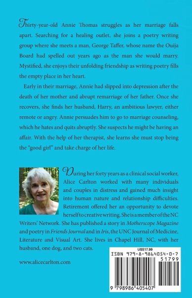 Thirty-year-old Annie Thomas struggles as her marriage falls apart. Searching for a healing outlet, she joins a poetry writing group where she meets a man, George Taffer, whose name the Ouija Board had spelled out years ago as the man she would marry. Mystified, she enjoys their unfolding friendship as writing poetry fills the empty place in her heart. Early in their marriage, Annie had slipped into depression after the death of her mother and abrupt remarriage of her father. Once she recovers, she finds her husband, Harry, an ambitious lawyer, either remote or angry. Annie persuades him to go to marriage counseling, which he hates and quits abruptly. She suspects he might be having an affair. With the help of her therapist, she learns she must stop being the "good girl" and take charge of her life.