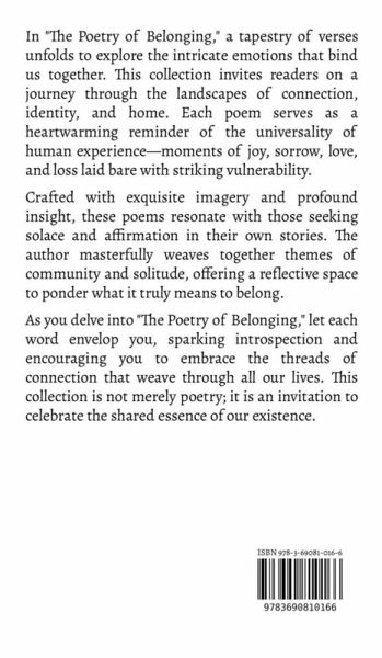 In "The Poetry of Belonging," a tapestry of verses unfolds to explore the intricate emotions that bind us together. This collection invites readers on a journey through the landscapes of connection, identity, and home. Each poem serves as a heartwarming reminder of the universality of human experience-moments of joy, sorrow, love, and loss laid bare with striking vulnerability. Crafted with exquisite imagery and profound insight, these poems resonate with those seeking solace and affirmation in their own stories. The author masterfully weaves together themes of community and solitude, offering a reflective space to ponder what it truly means to belong. As you delve into "The Poetry of Belonging," let each word envelop you, sparking introspection and encouraging you to embrace the threads of connection that weave through all our lives. This collection is not merely poetry; it is an invitation to celebrate the shared essence of our existence.