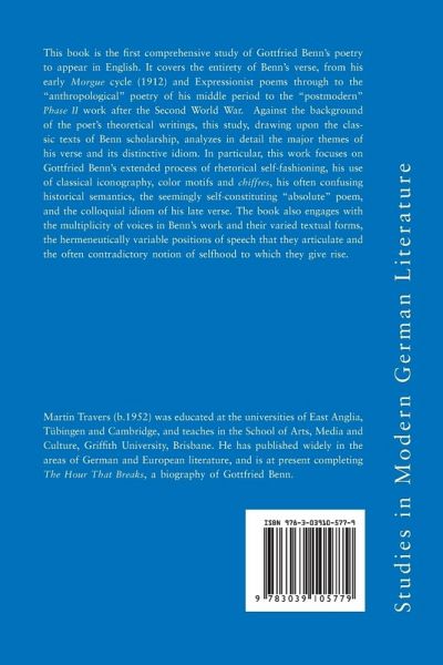 This book is the first comprehensive study of Gottfried Benn's poetry to appear in English. It covers the entirety of Benn's verse, from his early Morgue cycle (1912) and Expressionist poems through to the «anthropological» poetry of his middle period to the «postmodern» Phase II work after the Second World War. Against the background of the poet's theoretical writings, this study, drawing upon the classic texts of Benn scholarship, analyzes in detail the major themes of his verse and its distinctive idiom. In particular, this work focuses on Gottfried Benn's extended process of rhetorical self-fashioning, his use of classical iconography, color motifs and chiffres, his often confusing historical semantics, the seemingly self-constituting «absolute» poem, and the colloquial idiom of his late verse. The book also engages with the multiplicity of voices in Benn's work and their varied textual forms, the hermeneutically variable positions of speech that they articulate and the oftencontradictory notion of selfhood to which they give rise.
