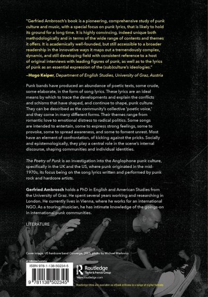 Punk bands have produced an abundance of poetic texts, some crude, some elaborate, in the form of song lyrics. These lyrics are an ideal means by which to trace the developments and explain the conflicts and schisms that have shaped, and continue to shape, punk culture. They can be described as the community's collective 'poetic voice,' and they come in many different forms. Their themes range from romantic love to emotional distress to radical politics. Some songs are intended to entertain, some to express strong feelings, some to provoke, some to spread awareness, and some to foment unrest. Most have an element of confrontation, of kicking against the pricks. Socially and epistemologically, they play a central role in the scene's internal discourse, shaping communities and individual identities. The Poetry of Punk is an investigation into the Anglophone punk culture, specifically in the UK and the US, where punk originated in the mid-1970s, its focus being on the song lyrics written and performed by punk rock and hardcore artists.