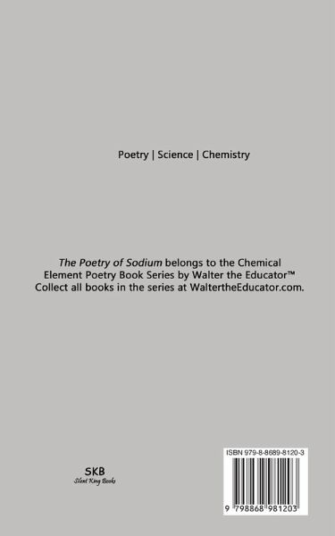 "Earning a degree in chemistry changed my life!" - Walter the Educator. This book is dedicated to all the chemistry lovers, like myself, across the world. The Poetry of Sodium belongs to the Chemical Element Poetry Book Series by Walter the Educator¿. Collect all books in the series at WaltertheEducator.com. Creating a poetry book about the chemical element of Sodium is a unique and creative way to explore the properties and characteristics of this element. By using poetry, I can describe the various uses and applications of Sodium, as well as its role in the natural world. Additionally, poetry can be used to convey the more abstract qualities of Sodium, such as its potential for explosive reactions or its ability to form strong bonds with other elements. Overall, a poetry book about Sodium can provide a fresh and engaging perspective on this important element.
