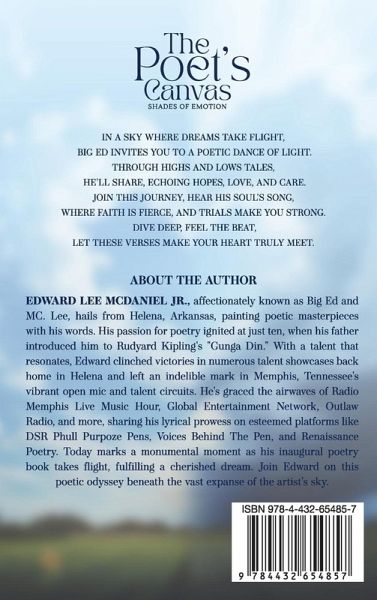 Edward Lee McDaniel Jr., known by the monikers Big Ed and MC. Lee, hails from Helena, Arkansas, where he delves into the art of poetry. His inspiration traces back to his father's recitation of Rudyard Kipling's "Gunga Din" during his formative years. With a captivating way with words, Edward clinched victories in numerous talent shows in his hometown and left an indelible mark in the open mic circuit and local talent scene in Memphis, Tennessee. His poetic prowess has garnered attention on various platforms, including Radio Memphis Live Music Hour, Global Entertainment Network, Outlaw Radio, Dubceez Entertainment Network, and several other poetry podcasts like DSR Phull Purpoze Pens, Voices Behind The Pen, and Renaissance Poetry. Finally, after much anticipation, Edward joyfully unveils his debut poetry book to the world, a realization of his lifelong dream. Join him as he leads you through the poetic expanse Beneath The Poet's Sky.