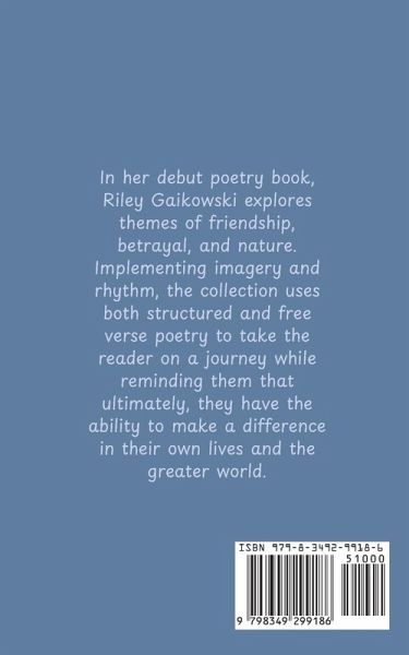 In her debut poetry book, Riley Gaikowski explores themes of friendship, betrayal, and nature. Implementing imagery and rhythm, the collection uses both structured and free verse poetry to take the reader on a journey while reminding them that ultimately, they have the ability to make a difference in their own lives and the greater world.