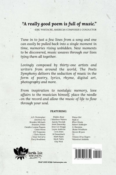 "A really good poem is full of music." -Eric Whitacre, American Composer & Conductor Tune in to just a few lines from a song and one can easily be pulled back into a single moment in time, memories rising unbidden. New moments to be discovered, music weaves through our lives tying them all together. Lovingly composed by thirty-one artists and writers from around the world, The Poets Symphony delivers the seduction of music in the form of poetry, lyrics, rhyme, digital art, photography and more. From inspiration to nostalgic memory, love affairs to the musician himself, place the needle on the record and allow the music of life to flow through your soul.