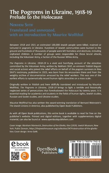 Between 1918 and 1921 an estimated 100,000 Jewish people were killed, maimed or tortured in pogroms in Ukraine. Hundreds of Jewish communities were burned to the ground and hundreds of thousands of people were left homeless and destitute, including orphaned children. A number of groups were responsible for these brutal attacks, including the Volunteer Army, a faction of the Russian White Army. The Pogroms in Ukraine, 1918-19: Prelude to the Holocaust is a vivid and horrifying account of the atrocities committed by the Volunteer Army, written by Nokhem Schtif, an eminent Yiddish linguist and social activist who joined the relief efforts on behalf of the pogrom survivors in Kiev. Schtif's testimony, published in 1923, was born from his encounters there and from the weighty archive of documentation amassed by the relief workers. This was one of the earliest efforts to systematically record human rights atrocities on a mass scale. Originally written in Yiddish and here skillfully translated and introduced by Maurice Wolfthal, The Pogroms in Ukraine, 1918-19 brings to light a terrible and historically neglected series of persecutions that foreshadowed the Holocaust by twenty years. It is essential reading for academics and students in the fields of human rights, Jewish studies, Russian and Soviet studies, and Ukraine studies.