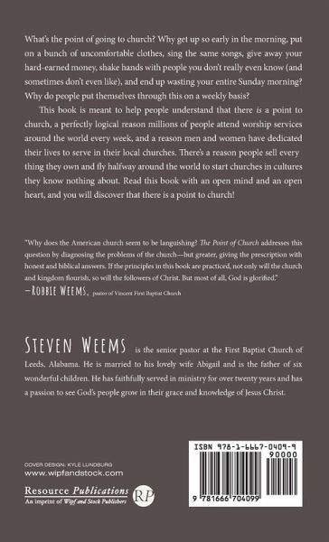 What's the point of going to church? Why get up so early in the morning, put on a bunch of uncomfortable clothes, sing the same songs, give away your hard-earned money, shake hands with people you don't really even know (and sometimes don't even like), and end up wasting your entire Sunday morning? Why do people put themselves through this on a weekly basis? This book is meant to help people understand that there is a point to church, a perfectly logical reason millions of people attend worship services around the world every week, and a reason men and women have dedicated their lives to serve in their local churches. There's a reason people sell everything they own and fly halfway around the world to start churches in cultures they know nothing about. Read this book with an open mind and an open heart, and you will discover that there is a point to church!