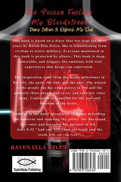 This book is based on a diary that was kept for three years by Raven Ella Ozlyn. She is transitioning from civilian to active military. Everyone mentioned in this book is protected by aliases. This book is deep, vulnerable, and triggers the emotions with real experiences that keeps you captivated. The inspiration came from the major milestones in her life, the good, the bad, and the ugly. The poison is the people she has come across in life and the audacity these people had to try and take her voice away. Confession is beautiful for the soul and freedom of the heart. Indulge in the daily adventures of Raven defending the innocent and exposing the guilty. She has found her voice and accepted her purpose in life. John 8:32 "And you will know the truth and the truth will set you free."