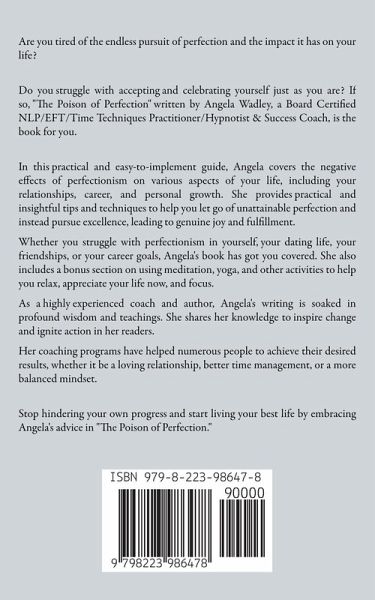 Are you tired of the endless pursuit of perfection and the impact it has on your life? Do you struggle with accepting and celebrating yourself just as you are? If so, "The Poison of Perfection" written by Angela Wadley, a Board Certified NLP/EFT/Time Techniques Practitioner/Hypnotist & Success Coach, is the book for you. In this practical and easy-to-implement guide, Angela covers the negative effects of perfectionism on various aspects of your life, including your relationships, career, and personal growth. She provides practical and insightful tips and techniques to help you let go of unattainable perfection and instead pursue excellence, leading to genuine joy and fulfillment. Whether you struggle with perfectionism in yourself, your dating life, your friendships, or your career goals, Angela's book has got you covered. She also includes a bonus section on using meditation, yoga, and other activities to help you relax, appreciate your life now, and focus. As a highly experienced coach and author, Angela's writing is soaked in profound wisdom and teachings. She shares her knowledge to inspire change and ignite action in her readers. Her coaching programs have helped numerous people to achieve their desired results, whether it be a loving relationship, better time management, or a more balanced mindset. Stop hindering your own progress and start living your best life by embracing Angela's advice in "The Poison of Perfection." "…highly recommended," Chick Lit Café. "…stimulating, inspiring, encouraging, and empowering," OnlineBookClub. * First place winner in the Chick Lit Café Excellence Award *