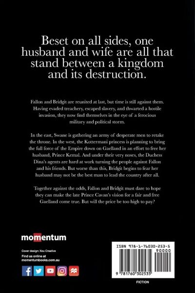 Beset on all sides, one husband and wife are all that stand between a kingdom and its destruction. Fallon and Bridgit are reunited at last, but time is still against them. Having evaded treachery, escaped slavery, and thwarted a hostile invasion, they now find themselves in the eye of a ferocious military and political storm. In the east, Swane is gathering an army of desperate men to retake the throne. In the west, the Kottermani princess is planning to bring the full force of the Empire down on Gaelland in an effort to free her husband, Prince Kemal. And under their very noses, the Duchess Dina's agents are hard at work turning the people against Fallon and his friends. But worse than this, Bridgit begins to fear her husband may not be the best man to lead the country after all. Together against the odds, Fallon and Bridgit must dare to hope they can make the late Prince Cavan's vision for a fair and free Gaelland come true. But will the price be too high to pay? An epic fantasy perfect for fans of George RR Martin, David Gemmell and Raymond E. Feist.