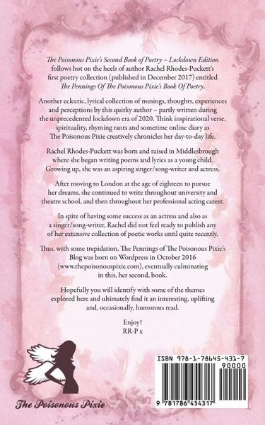 'The Poisonous Pixie's Second Book of Poetry - Lockdown Edition' follows hot on the heels of author, Rachel Rhodes-Puckett's, first poetry collection (published in December 2017) entitled 'The Pennings Of The Poisonous Pixie's Book Of Poetry'. Another eclectic, lyrical collection of musings, thoughts, experiences and perceptions by this quirky author - partly written during the unprecedented lockdown era of 2020. Think inspirational verse, spirituality, rhyming rants and sometime online diary as The Poisonous Pixie creatively chronicles her day-to-day life.